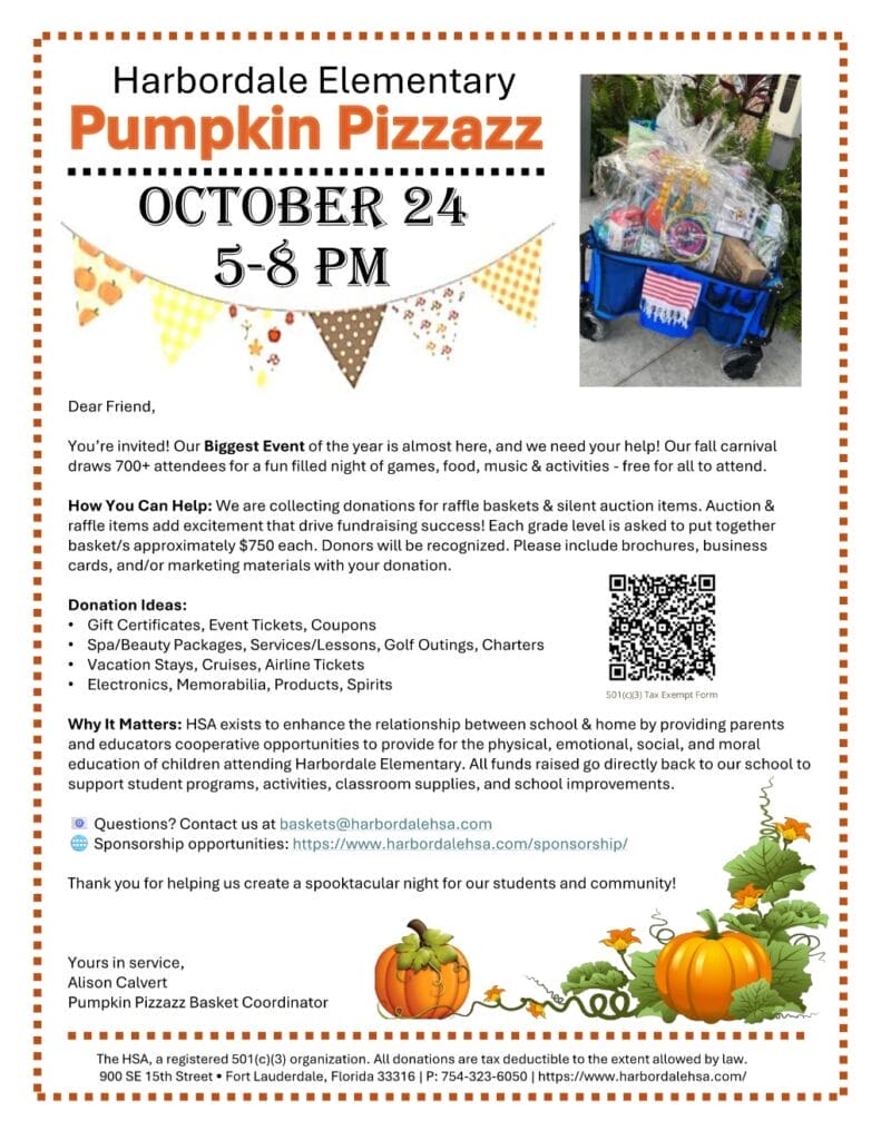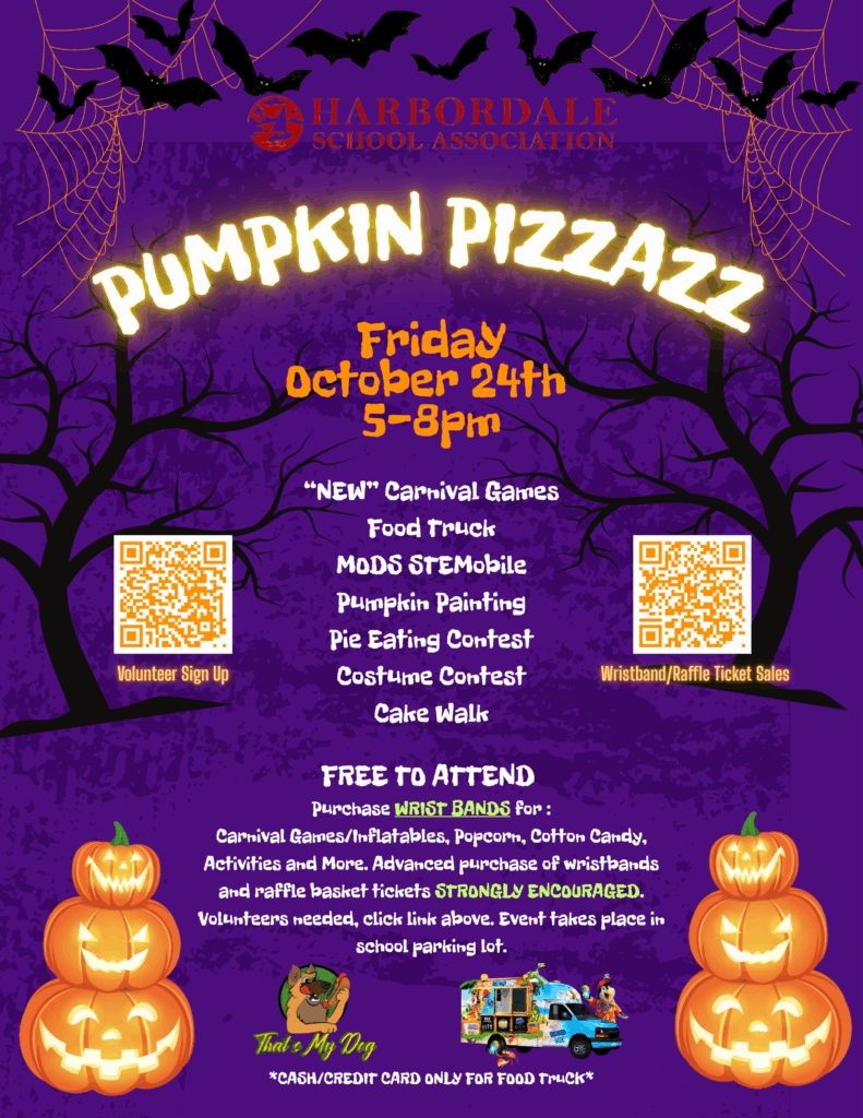 Harbordale School Association Pumpkin Pizzazz Friday, October 24th | 5-8pm “NEW” Carnival Games Food Truck MODS STEMobile Pumpkin Painting Pie Eating Contest Costume Contest Cake Walk Sign up https://www.harbordalehsa.com/sign-ups/?sheet_id=275 Ticket Purchase https://www.harbordalehsa.com/pumpkin-pizzazz-fri-oct-24-2025/ FREE TO ATTEND Purchase WRIST BANDS for : Carnival Games/Inflatables, Popcorn, Cotton Candy, Activities and More. Advanced purchase of wristbands and raffle basket […]